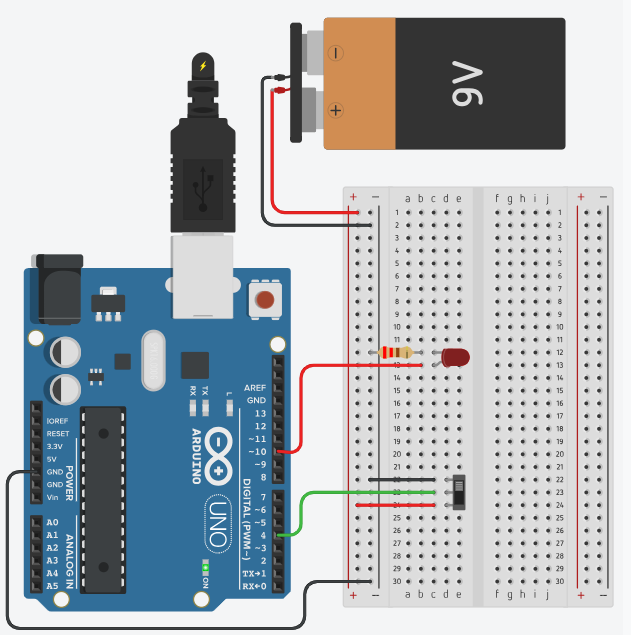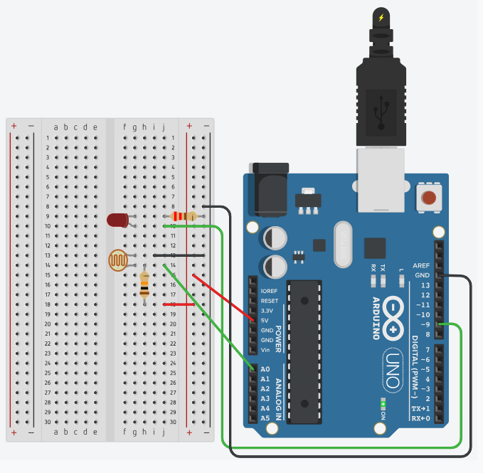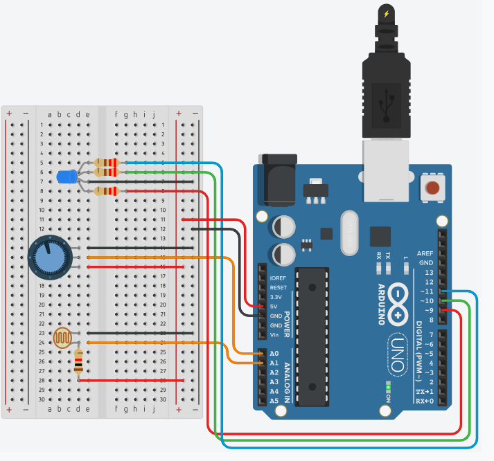 RGB LED ühendati Arduino plaadiga ning iga värv määrati vastavale PWM-väljundile (RED = 11, GREEN = 10, BLUE = 9). Lisaks ühendati kaks andurit: potentsiomeeter (A0) ja fotorresistor (A1).