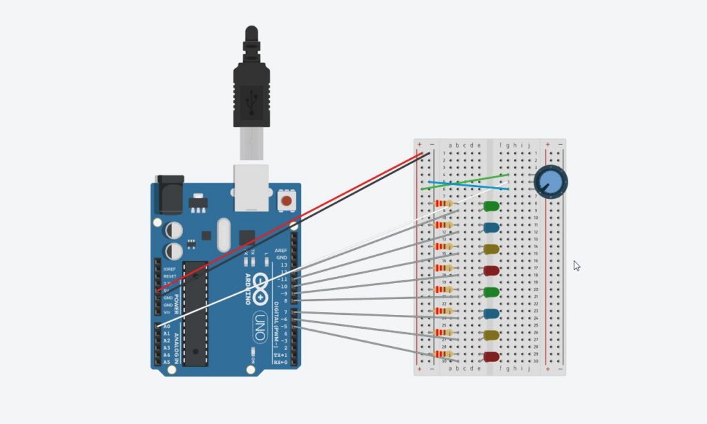 - Светодиоды подключены к цифровым пинам 2–10 (через резисторы).